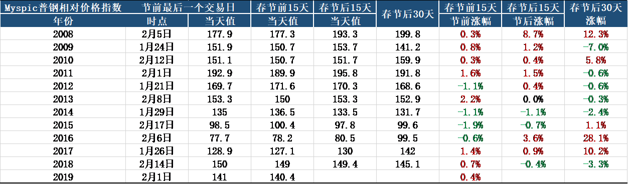 In terms of specific prices, from the comparison of Myspicpugang's price index before and after the Spring Festival in previous years, there are 70 % of the probability that prices will rise and fall on the 15th before and after the last decade. Before the Spring Festival of 2019, the steel price index accumulated a slight increase of 0.4 %, and it is expected that there will be a large probability of a good start.